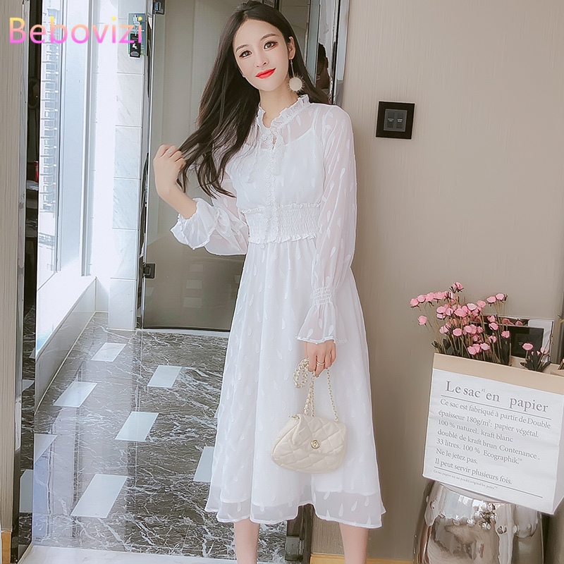 Fashion Korean White Long Sleeve Chiffon Women Dress Casual Dinner Elegant A Line Long Dresses Shopee Philippines